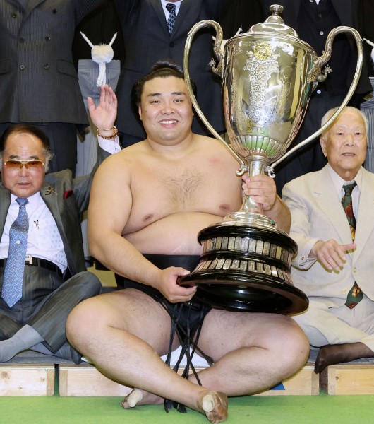 大相撲春場所で初優勝を果たし、賜杯を手に笑顔を見せる関脇霧馬山=26日、エディオンアリーナ大阪(代表撮影)