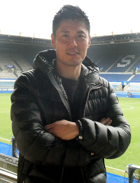 本拠地スタンドで撮影に応じる川島(写真)元川悦子