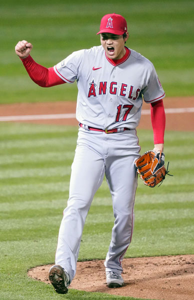 2開幕戦のアスレチック戦、ピンチを連続三振で切り抜け、雄たけびを上げる先発の大谷(C)共同通信社