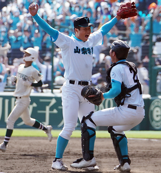 優勝の瞬間、両手を突き上げて喜ぶ山梨学院・林(中央)と捕手の佐仲(C)日刊ゲンダイ