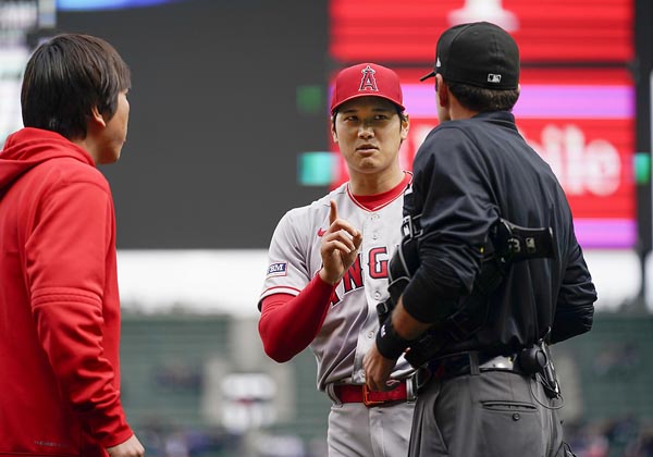 5日のマリナーズ戦ではピッチクロック違反を取られた大谷(1回裏を投げ終えた後に球審と話す)/(C)AP=共同