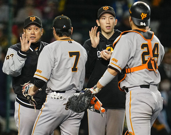 4失点も3勝目を挙げてナインを迎える戸郷(右2)と原監督(C)共同通信社