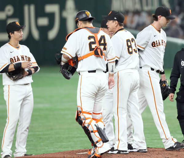 4回に先発のビーティー(右)に交代を告げた原監督(右2)/(C)日刊ゲンダイ