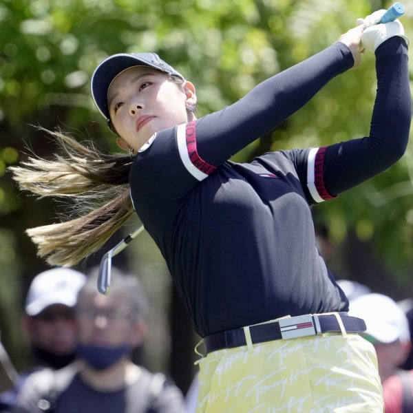 第2日、6番でティーショットを放つ吉田優利。通算4アンダーで首位=茨城GC(C)共同通信社