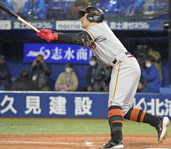 三回に中犠打を放つ岡本和真(C)共同通信社