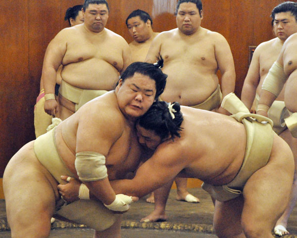 時津風部屋に出稽古し、汗を流す大栄翔(手前左)と霧馬山(C)共同通信社