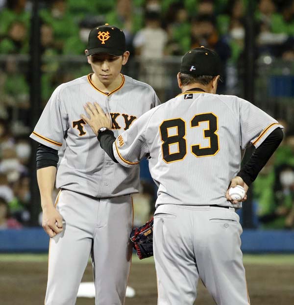 六回に原監督(右)に降板を告げられる戸郷(C)共同通信社