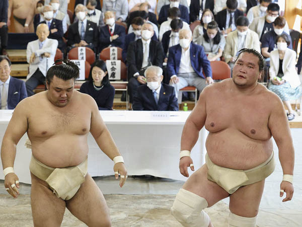 横綱審議委員会の稽古総見で照ノ富士(右)に胸を借りた霧馬山(C)共同通信社