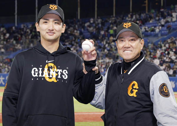 4月23日にプロ初勝利を挙げた横川(左)とポーズをとる原監督(C)共同通信社