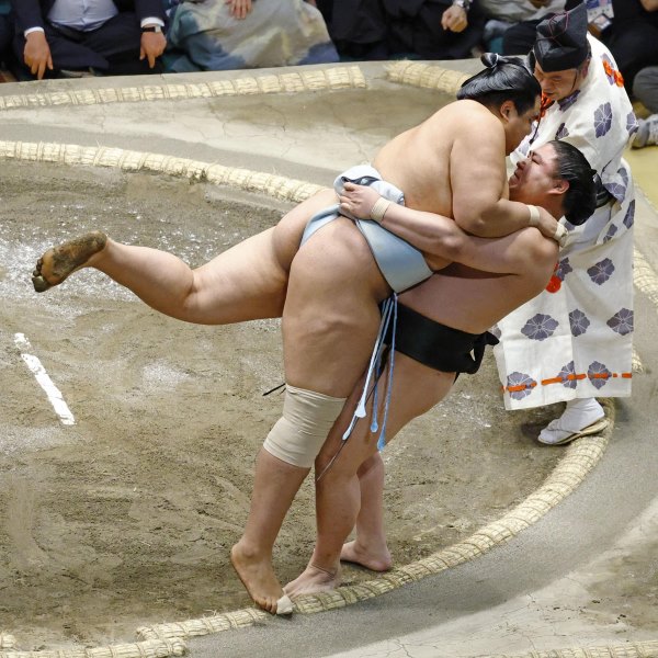 若元春(右)がうっちゃりで北青鵬を破る=両国国技館(C)共同通信社
