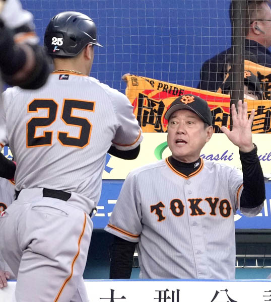 二回、同点ソロを放った岡本和真を迎える巨人・原監督(C)共同通信社