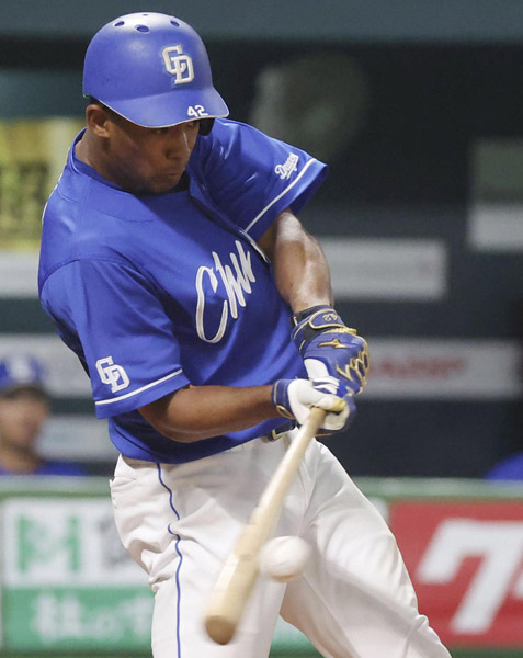 7回中日2死満塁、右越えに走者一掃の三塁打を放つブライト健太(C)共同通信社
