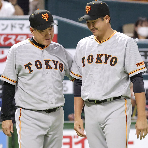 試合後、原監督(左)と話をする菅野(C)共同通信社
