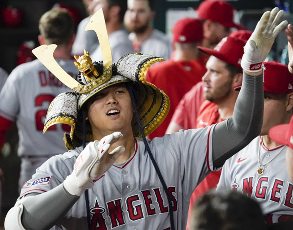 何回、兜をかぶれるか(13日、レンジャース戦の七回、19号ソロ本塁打を放ちチームメイトに出迎えられる大谷) (C)ロイター/USA TODAY Sports