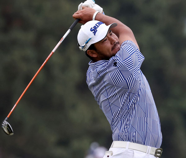 第1ラウンド8番でティーショットを放つ松山(C)ロイター/USA TODAY Sports
