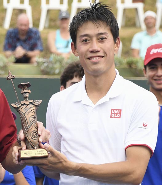 復帰戦で優勝し、トロフィーを手に笑顔の錦織(C)共同通信社