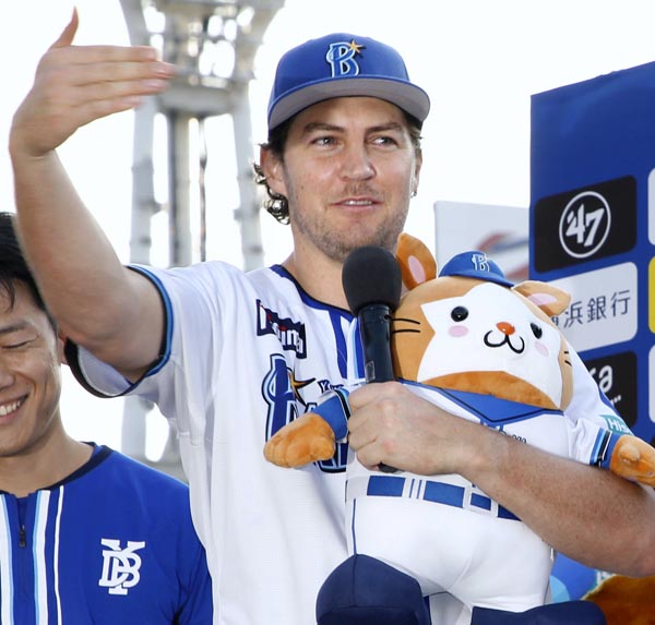 25日の阪神戦で勝利し笑顔でヒーローインタビューに答えるバウアー(C)共同通信社