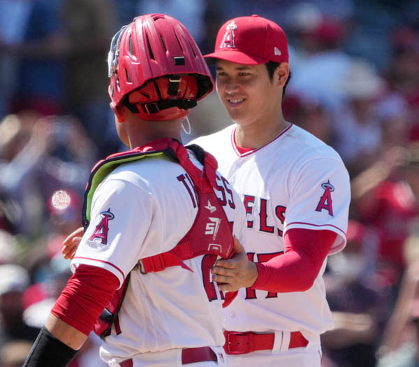 マット・サイス捕手と勝利を喜ぶ大谷翔平(C)ロイター/USA TODAY Sports