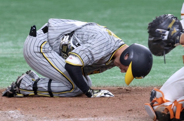 死球を食らった阪神・近本(C)日刊ゲンダイ