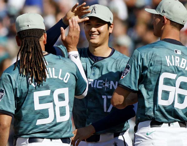 オールスター戦でア・リーグナインとハイタッチを交わす大谷(C)ロイター/USA TODAY Sports