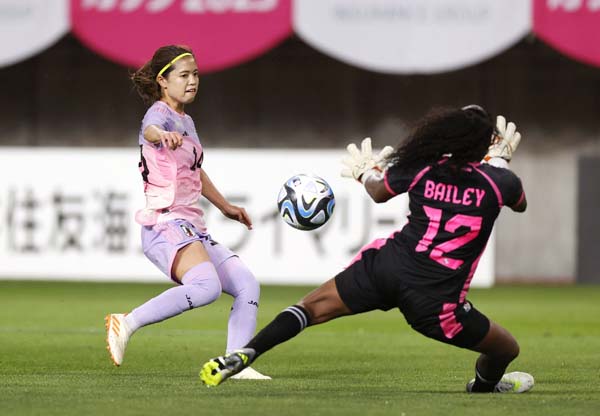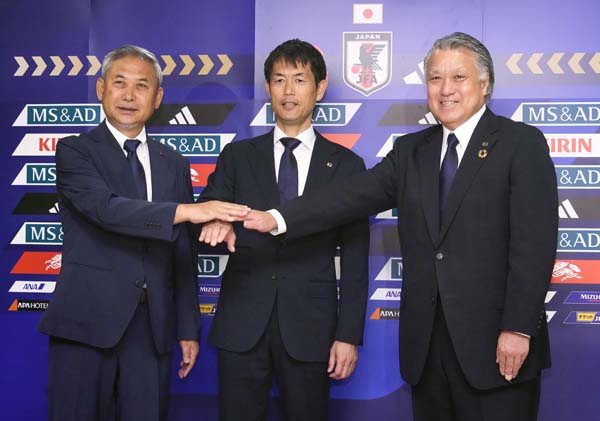 右からJFA田嶋会長、なでしこ池田監督、JFA佐々木女子委員長(元なでしこ監督)/(C)共同通信社