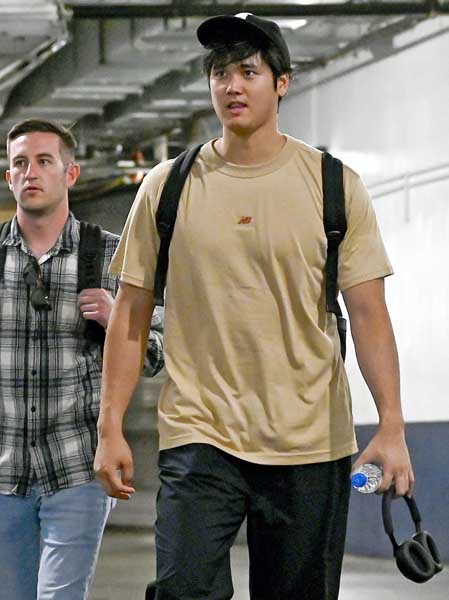 いざ、ポストシーズン進出へ!(27日、タイガース戦が悪天候のため中止となり、引き揚げる大谷)/(C)共同通信社