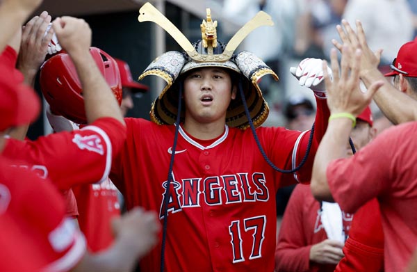 圧巻の活躍、この日は2回もかぶとをかぶった(大谷) (C)ロイター/USA TODAY Sports