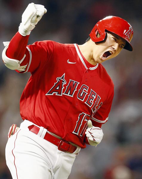 18日ヤンキース戦7回、大谷は3試合連続となる35号2ランを放ちガッツポーズ!(C)共同通信社