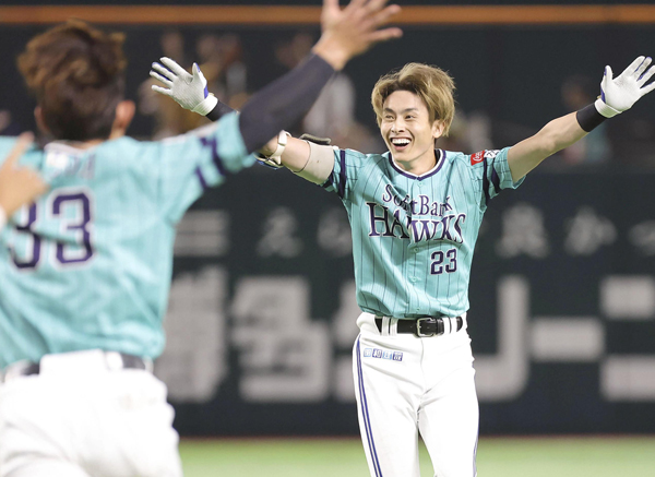 サヨナラ打を放ち両手を広げて喜ぶ周東(右)/(C)共同通信社