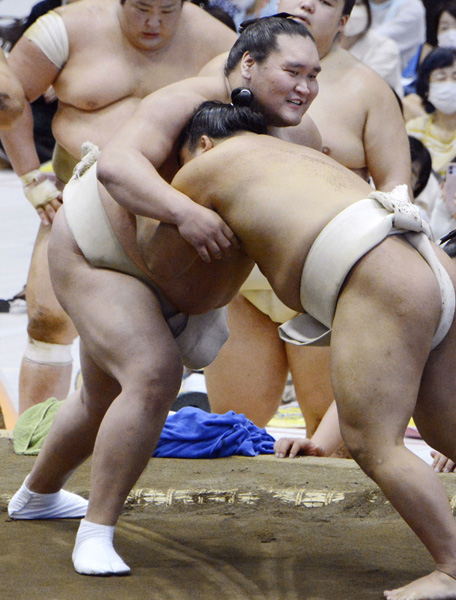ぶつかり稽古で胸を出す照ノ富士(C)共同通信社