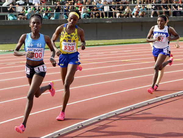女子1500メートル決勝で力走する選手たち。神村学園のカリバ・カロライン(左端)が大会新で優勝(C)共同通信社