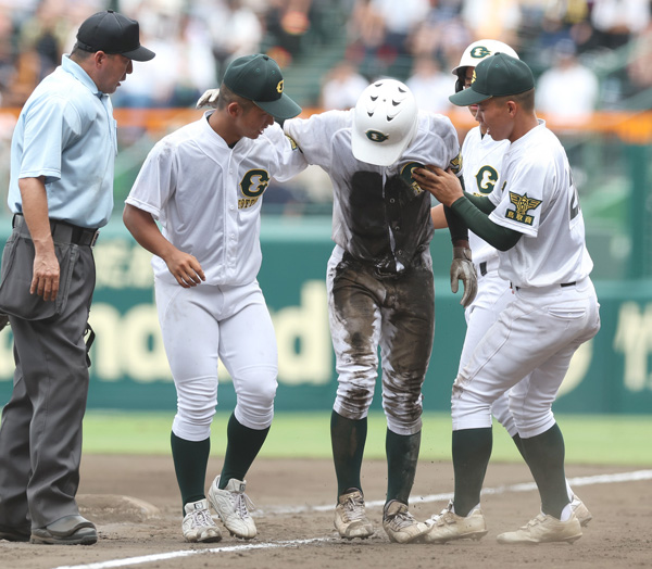 大会2日目、1塁走塁後に足がつった鳥取商の選手(C)日刊ゲンダイ