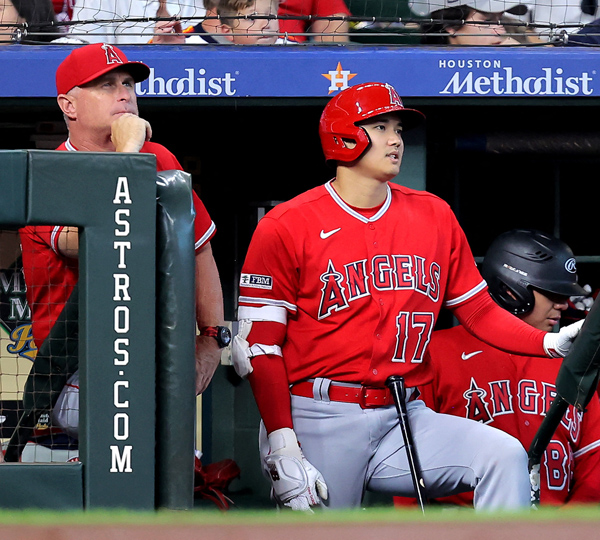 14日アストロズ戦、試合の展開をみるベンチの大谷(左はネビン監督) (C)ロイター/-USA TODAY Sports