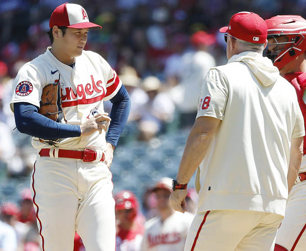 24日のレッズ戦の二回途中、ネビン監督に促されて降板する大谷(C)共同通信社