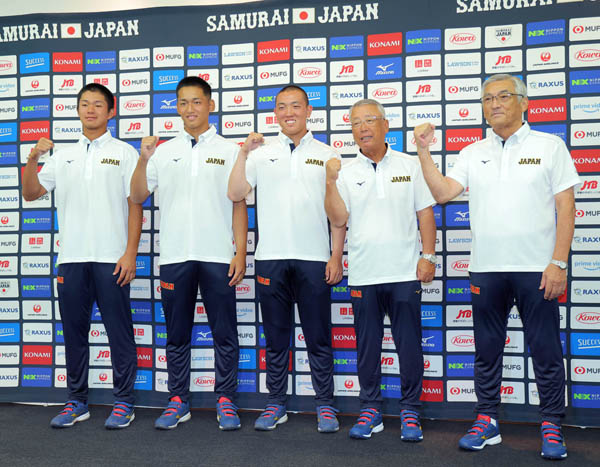 U18W杯日本代表の結団式。(左から)森田大翔、前田悠伍、小林隼翔キャプテン、馬淵史郎監督、北村雅敏団長(C)日刊ゲンダイ