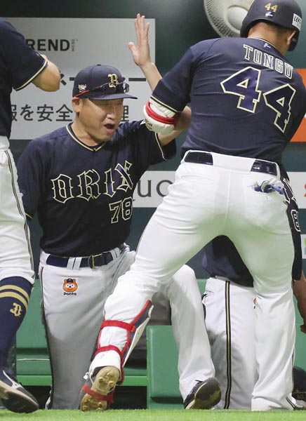 三回、2打席連続本塁打を放った頓宮を迎える中嶋監督(C)共同通信社