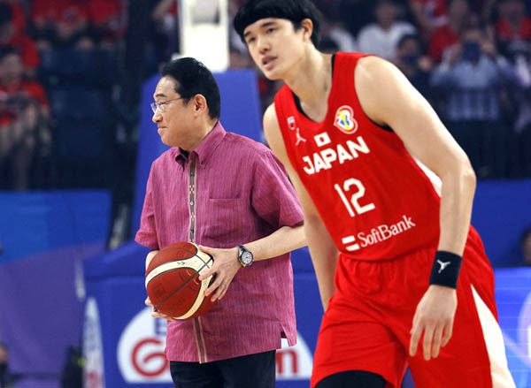 ボールを手にご機嫌(岸田首相=左、右は日本代表の渡辺、バスケットボール男子W杯の日本対ドイツ戦前のイベントで)/(C)ロイター