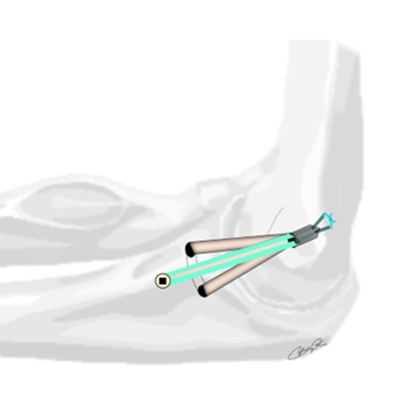 京都府立医大で実施しているハイブリッド手術のイラスト(茶色が移植靭帯、真ん中の緑色が人工靭帯)/(写真提供)京都府立医科大学