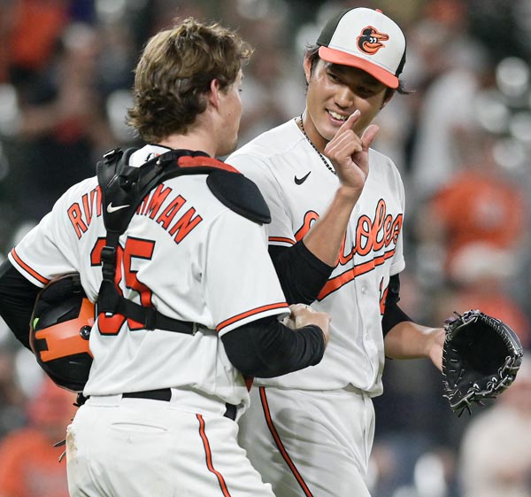 オリオールズの藤浪は大化け(ホワイトソックスを抑え込み、捕手ラッチマンと談笑する藤浪) (C)ロイター/USA TODAY Sports