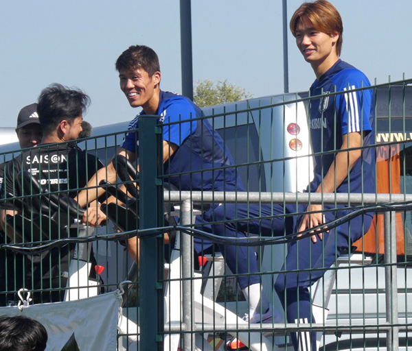 ドイツ戦快勝の立役者の冨安(左)と板倉がリラックスしながら調整(写真)元川悦子