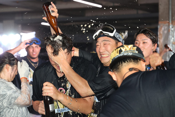 祝勝会のビールかけで歓び合う中嶋監督とナイン(C)日刊ゲンダイ