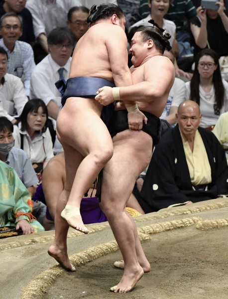 霧島(右)が上手投げで豊昇龍を破る=両国国技館(C)共同通信社
