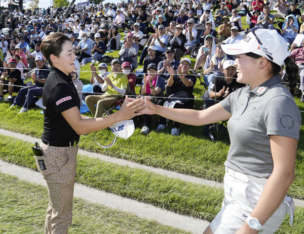 妹の千怜(右)の祝福を受ける岩井明愛。海外では芝質の違いに苦戦も(C)共同通信社