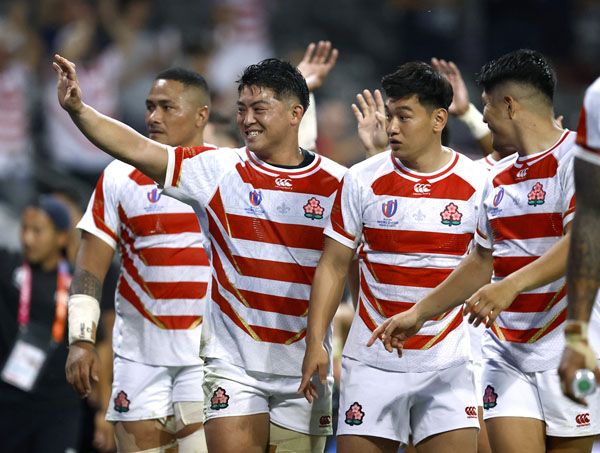 サモアに勝利しスタンドのファンに手を振る坂手、斎藤ら日本代表(C)ロイター