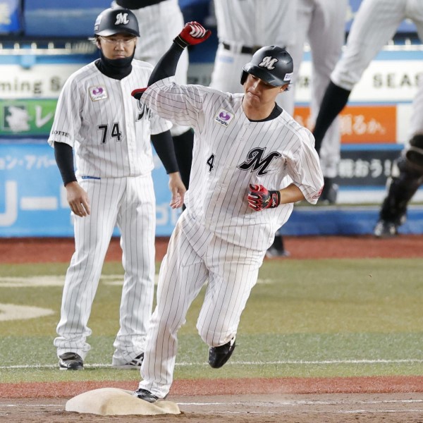 延長十回に同点3ランを放ったロッテ藤岡(C)共同通信社