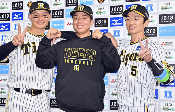 してやったり(左から森下、村上、近本)/(C)共同通信社