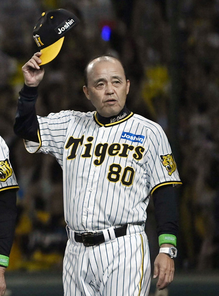 広島に勝利し、声援に応える岡田監督(C)共同通信社