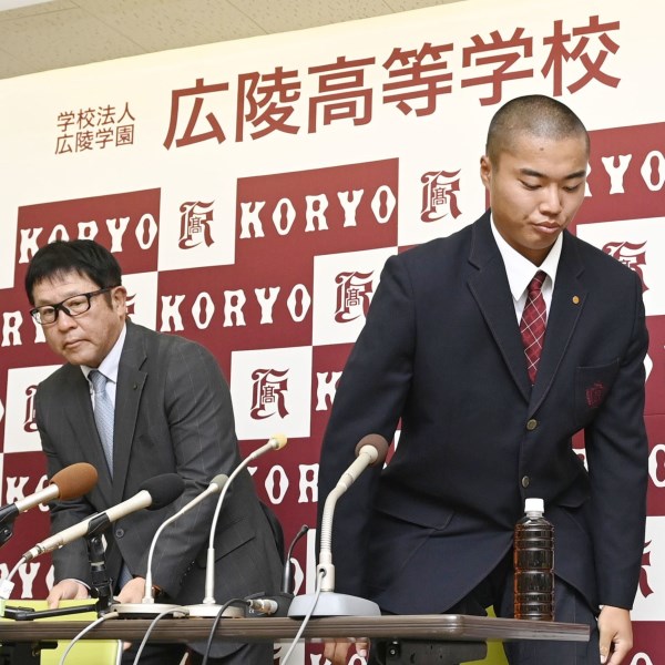 記者会見場を後にする広陵高の真鍋慧内野手。左は中井哲之監督(C)共同通信社
