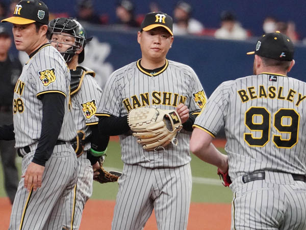 ボコボコにされた西勇輝(中央)/(C)日刊ゲンダイ