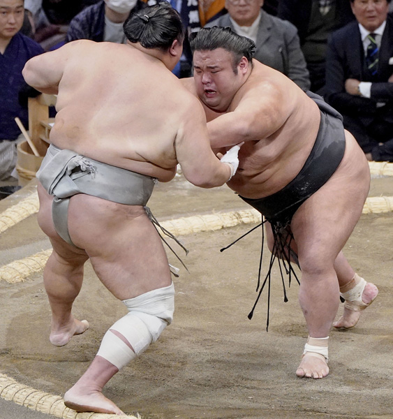 貴景勝(右埼玉栄の先輩(北勝富士=左)を難なく押し出し(C)共同通信社